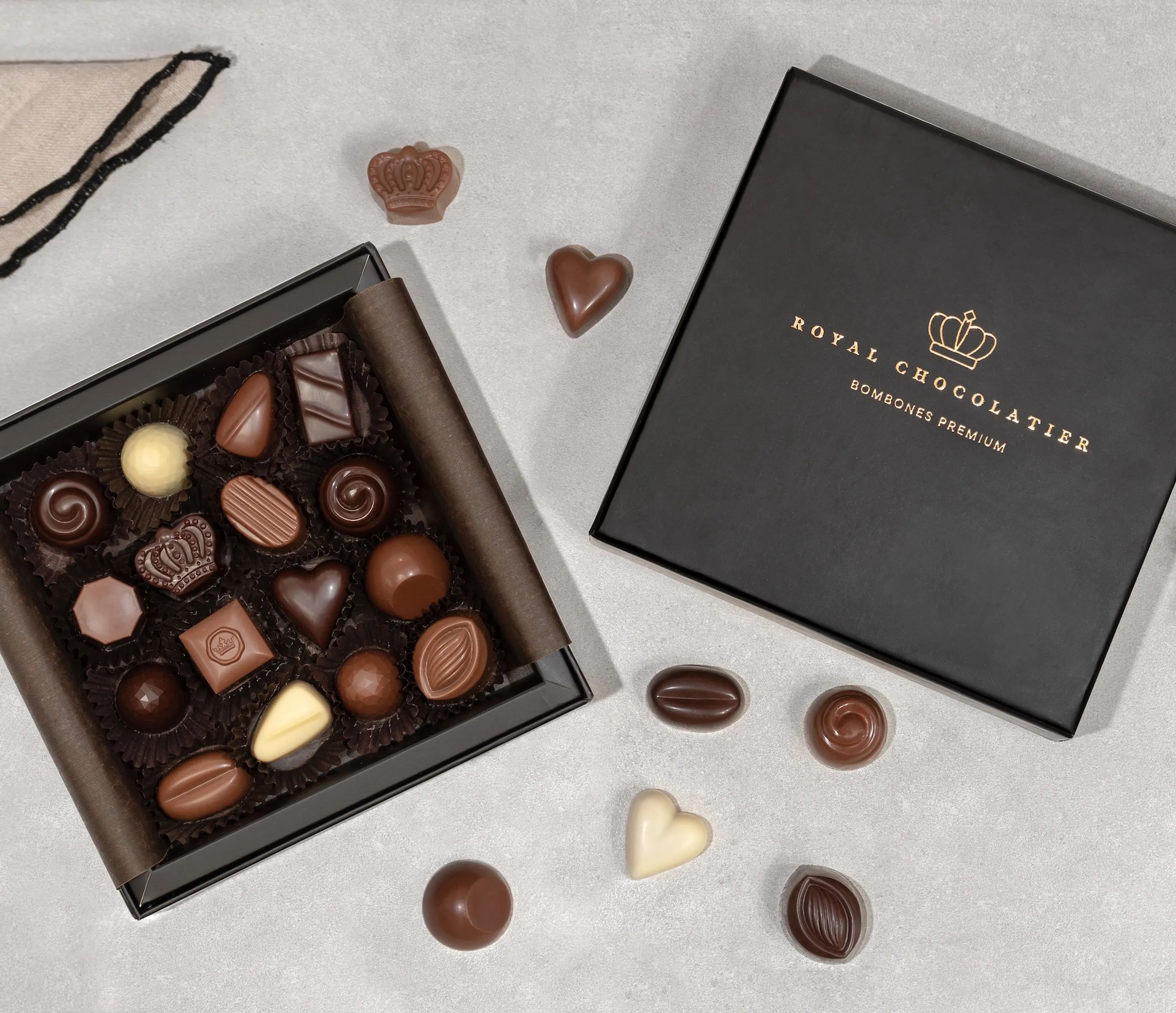 Selección Royal Chocolatier busca el equilibrio entre baños de chocolate de leche 36% cacao y chocolate bitter 56% cacao, logrando las mejores combinaciones de sabores de rellenos.